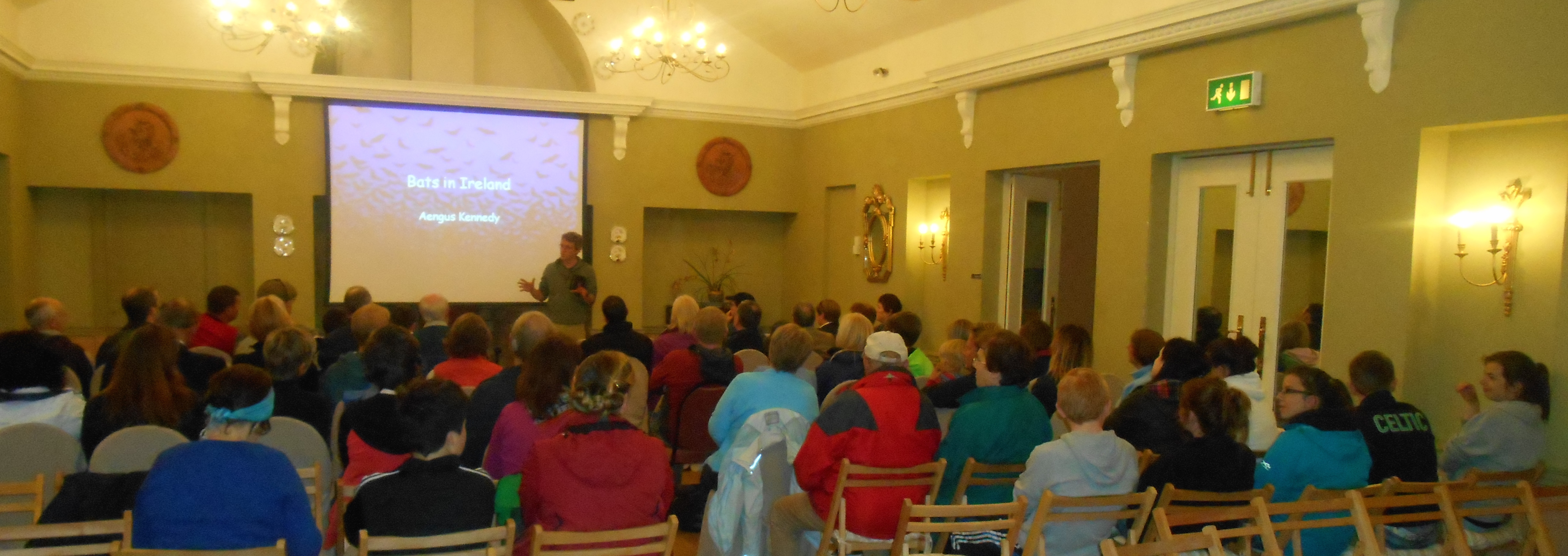 Rathmullan saw another large crowd of over 50 people. This time we started at 9.30 in the wonderful Rathmullan House. After a presentation which looked at bats in general we walked through the beachside woods identifying and chatting about some of the large and wonderful trees such as Monterey Cypress and Wych elm until we got to the short horse path. There we turned on our bat monitors and straight away heard both common and soprano pipistrelle as well as a couple of Leisler bats . Both evenings lasted about two hours in total. NatureNorthWest will run more bat walks and talks in 2015.